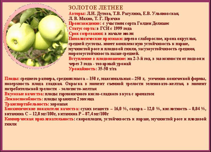 характеристики яблок Золотое летнее