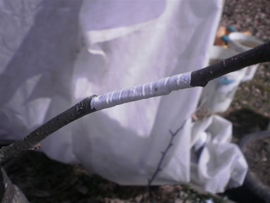Обвязку делаем полимерной изолентой или толстой лентой ФУМ. Витки кладем внахлест очень плотно, с натягом, чтобы обеспечить очень плотное прилегание тканей и не допустить попадания влаги на место прививки. Если не удается плотно закрыть лентой пенек на подвое его необходимо замазать садовым варом.